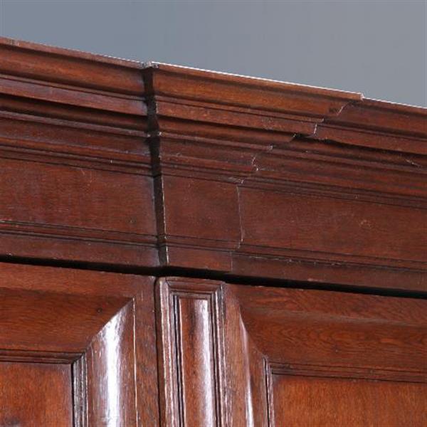 Grote robuuste 17e eeuwse tweedeurs kussenkast in eiken met palissander en ebbenhout. Geplaatst op twee gedraaide gezwarte houten bolpoten. De overhoeks geplaatste zijstijlen hebben in de kroon en in de voet naar buiten springende verkroppingen, ook de middenstijl is zo uitgevoerd. Dit draagt bij aan het architectonische karakter van deze opmerkelijke kast.