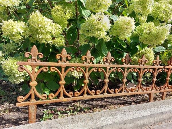 168 cm long cast metal garden grille 168 cm lengte zijn 2 delen van elks 84 cm op hoogte 35 cm zijn gemaakt uit gegoten metaal in prima staat patine roestig word veel gebruikt voor afboorden van tuin of planten perk worden zorgvuldig verpakt verstuurd .