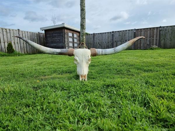 Geweldige XXL Giant Longhorn Bull-schedel voor wandpresentatie met geschuurde hoorns Materiaal: Been en Echte geschuurde hoorns Perfect voor een mancave of bar -> 150cm breed! Zeer decoratief object voor ieder interieur of tuin. Leuk voor in een mancave of gewoon als decoratie in huis. Aan de achterkant is een touw bevestigd. Voor transport verwijderen wij de hoorns, deze kunnen net als het touw met de meegeleverde schroeven weer teruggeschroefd worden (je ontvangt exact dezelfde schedel als op de foto's) Dit Xclusive artikel wordt zeer goed verpakt verzonden. Bovendien wordt er breekbare tape op het pakket geplakt en is er na verzending een trackcode beschikbaar om uw pakket te volgen.