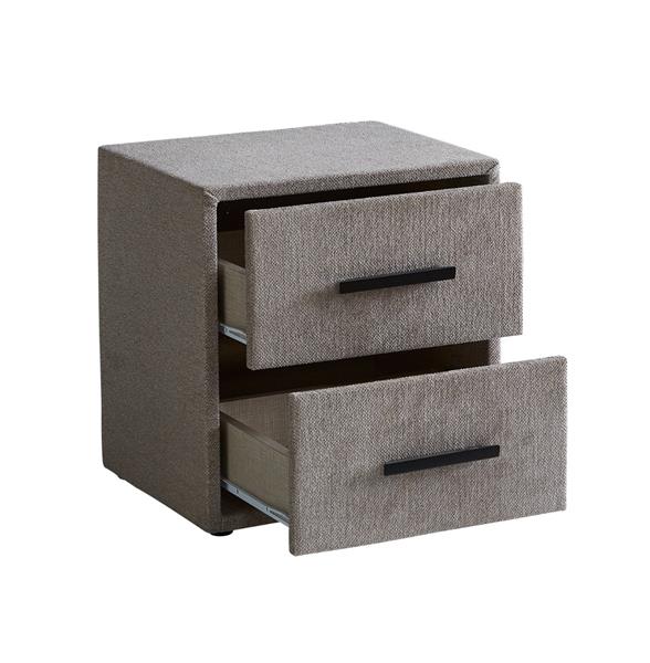 In dezelfde stijl en met dezelfde stoffering is een bijpassend nachtkastje met twee lades verkrijgbaar: