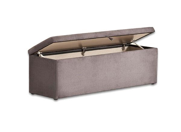 Ook is in deze collectie een mooie voetenbank/dekenkist verkrijgbaar (in twee formaten). Deze is eveneens gestoffeerd in dezelfde grijze stof.