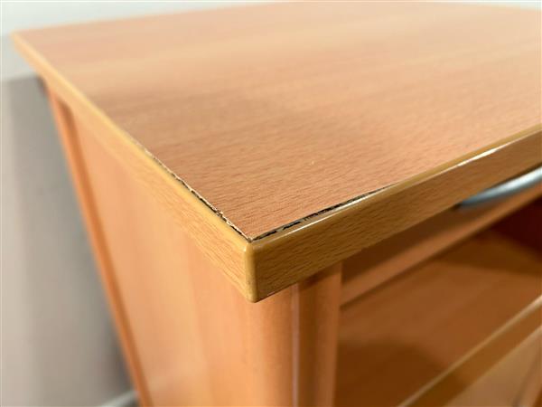 Het gebruikte Volker 33B 030 houten nachtkastje is technisch in perfecte staat maar heeft enkele kleine beschadigingen aan het bovenblad door het gebruik het intensief schoonmaken in het verzorgingstehuis.